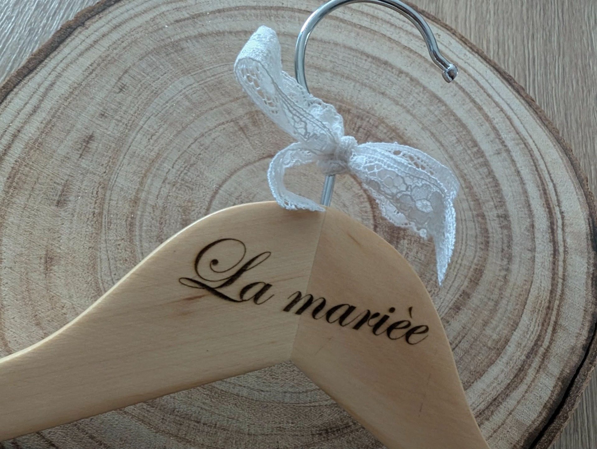 Ajoutez une touche d'élégance et de poésie à votre mariage avec ce cintre en bois gravé "La mariée", spécialement conçu pour accueillir la robe de mariée.