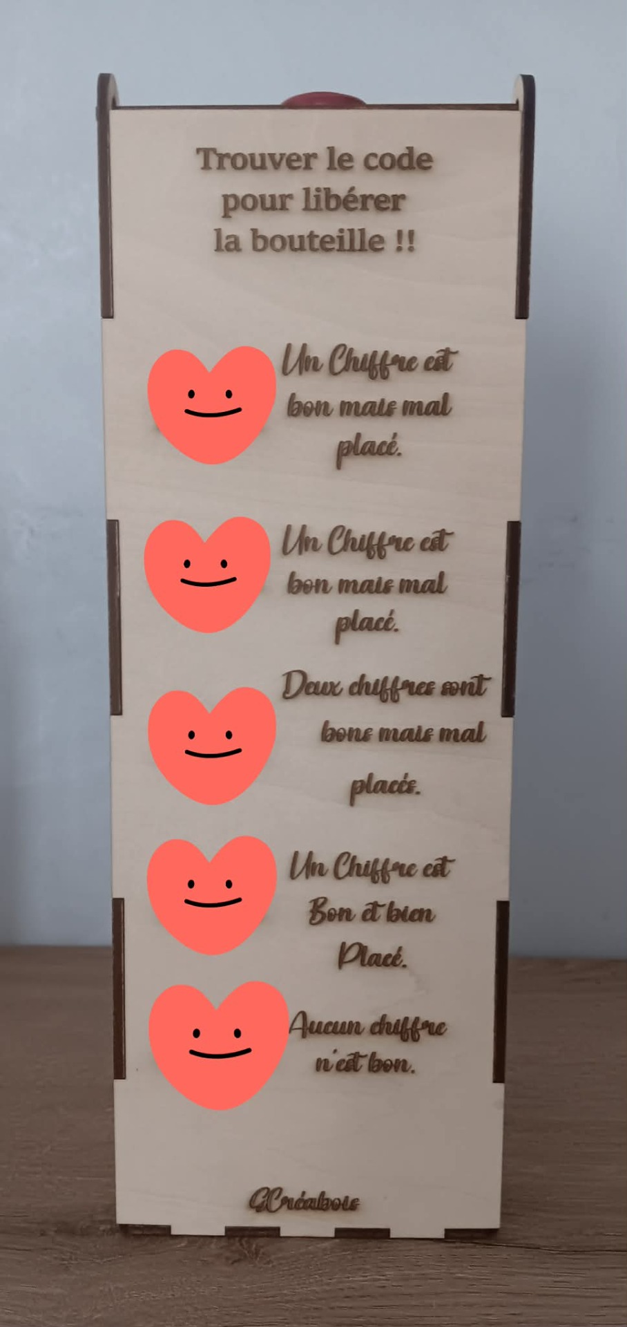 Transformez l’ouverture d’une bouteille en expérience ludique et originale grâce à notre coffret pour bouteille de vin en bois, équipé d’un cadenas et d’une énigme gravée au laser. Chaque coffret est personnalisable, ce qui en fait un cadeau unique et mémorable pour les amateurs de vin et de défis.